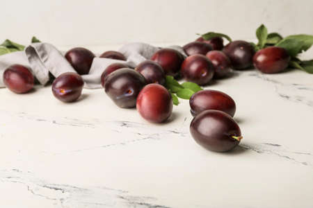 Fresh purple plums on marble counter in sunlight