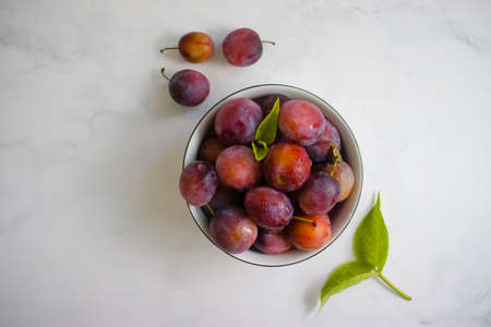 Damson Plum on white wooden surface. organic food concept.
