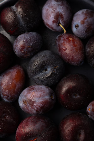 Fresh ripe plum fruits with water drops on stone concrete background, angle view macro