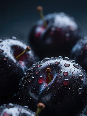 plums with water droplets on black background