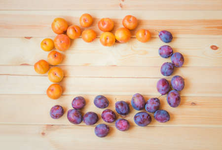 Plum. Fresh plum. Harvest. Autumn harvest. Autumn. Blue plums. Yellow plum. Fresh plums on a wooden surface. Fresh plums on wooden table background.