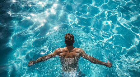 A relaxed, young man enjoying a refreshing swim in a sparkling blue pool on a hot summer day. The vibrant colors and the carefree atmosphere capture the essence of a perfect summer.
