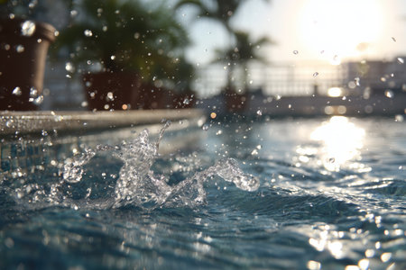 Water droplets leap into the air as they hit the surface of a clear, sparkling swimming pool under warm sunlight. The scene captures relaxation and joy.