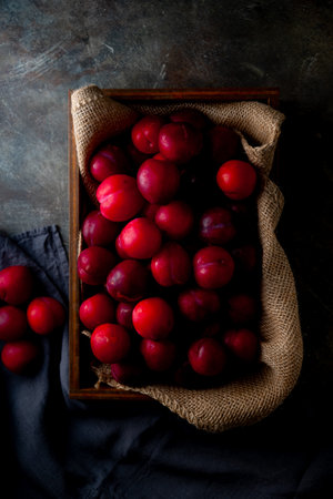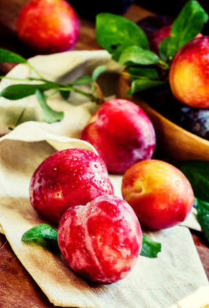 Sweet ripe red plums, healthy organic fruits close up