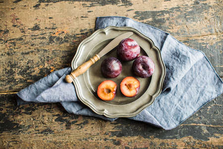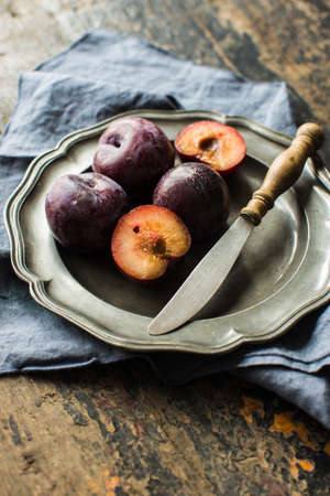 Fresh organic plums on old rustic wooden table
