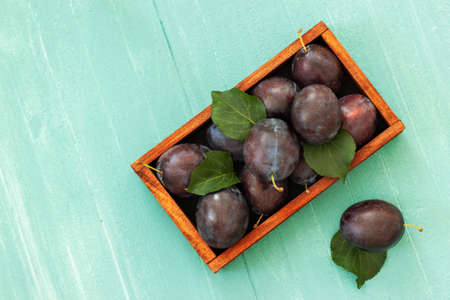 Freash plums in wooden box on wood table top view. Blue pulm with leaves. Food fruit background