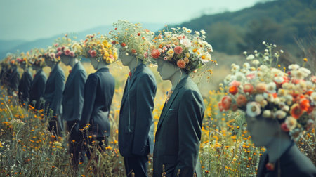 Mannequins with floral headpieces standing in a field as a representation of art and beauty