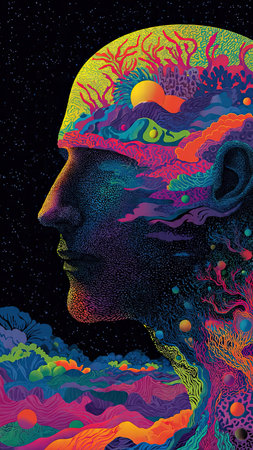 A man stands still, his head glowing with light amidst a mesmerizing swirl of cosmic patterns. The vibrant colors evoke a sense of deep introspection and enlightenment.