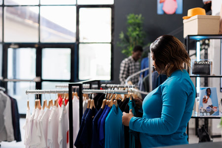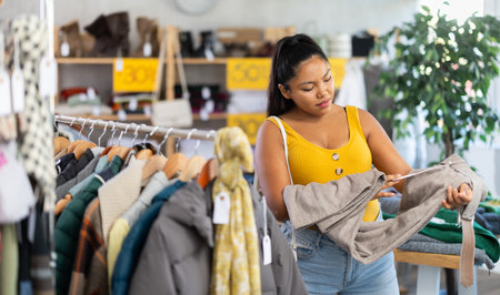Selective Latina woman choosing something for autumn-winter in clothing store