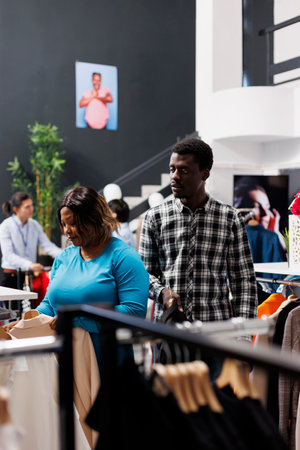 African american couple looking at stylish merchandise, checking clothes fabric in clothing store. Smiling customers enjoying shopping session, buying trendy outfits and accessories in modern boutique