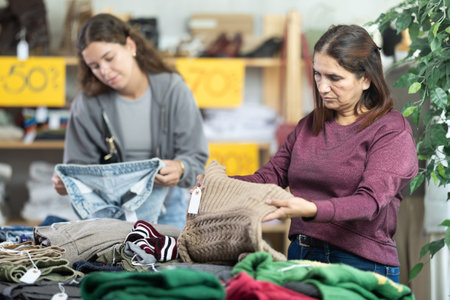 Two selective women choosing pantaloons and pullovers in clothing store