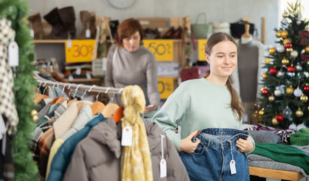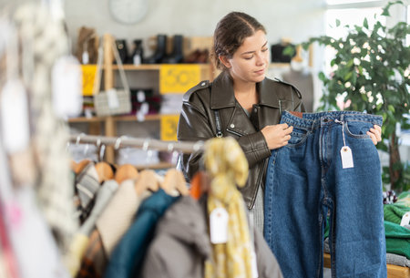 Teenage girl choosing jeans in clothing store