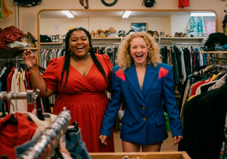 Two women are laughing in a vintage clothing store, embracing sustainable fashion and pre-owned clothes. A joyful shopping experience.