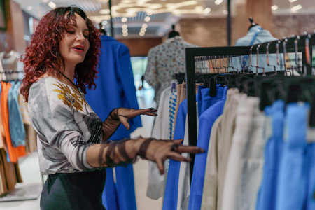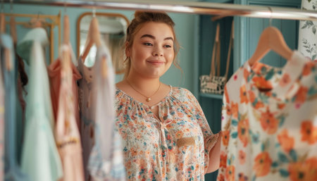 A curvy woman browsing through clothes in a boutique, finding the perfect outfit with a smile