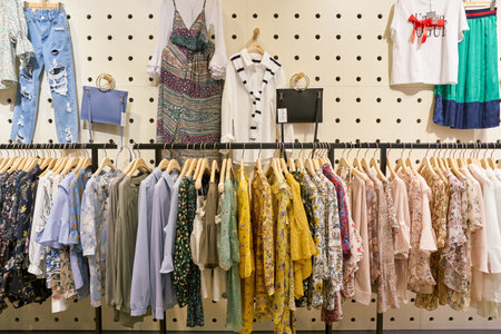 Fashionable clothes in a boutique store.