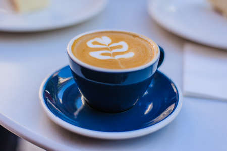 Cappuccino coffee cup at trendy cafe with latte art in foam on top of espresso drink in trendy blue mug on tabletop.
