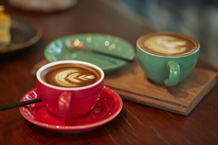 Hot coffee latte art in cup. hot drink coffee with milk froth for breakfast. Morning coffee break in a gourmet cafe. Rest with a friend in a cafe.