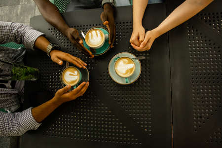 Multiethnic people holding coffee cups, top view