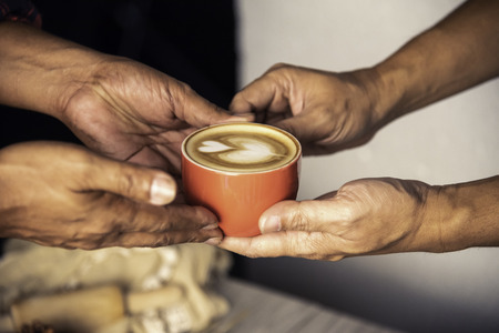 Man holding coffee cup with latte art, Selective focus