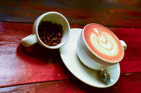 Hot art Cappuccino Coffee and coffee bean in cups on wooden table