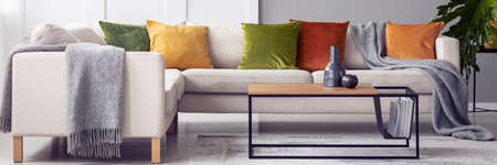 Panorama of wooden table in front of beige corner sofa with cushions in grey flat interior. Real photo