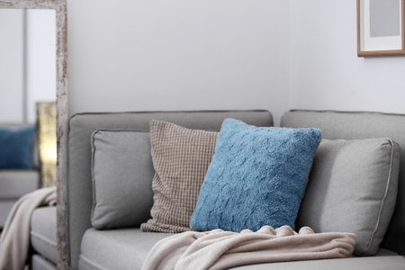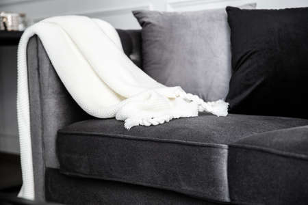 Living room interior with with gray fablic sofa, comfy pillows, plaid and knitting whithe blanket. Decoration modern room interior design.