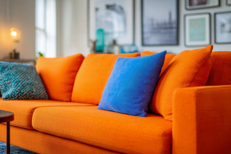 A lively orange sofa enhances the contemporary space, accented by plush blue and patterned pillows, illuminated by gentle warm lighting and chic decor details.