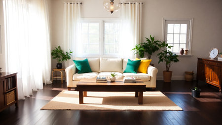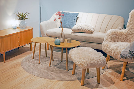 Luxury living room interior with white sofa and wooden coffee table. Nobody inside