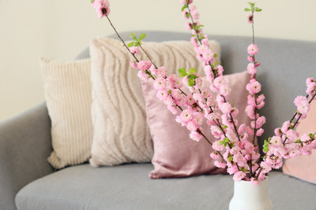 fabric sofa with pillows in Interior of modern guestroom in studio apartments