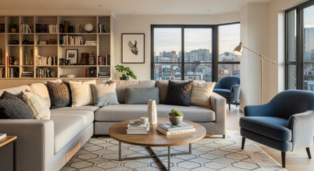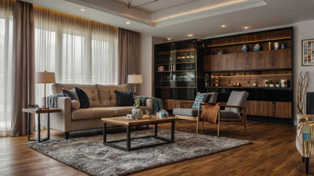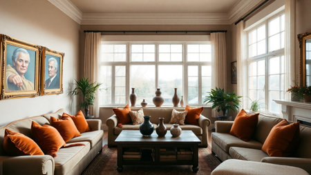 Cozy living room interior design with brown sofa, coffee table, books, plants and accessories