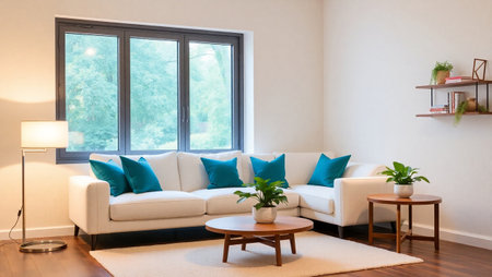 Modern living room interior with white sofa and coffee table. Nobody inside