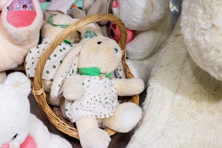 A colorful basket filled to the brim with a variety of stuffed animals, prominently featuring a delightful bunny in a lovely white dress