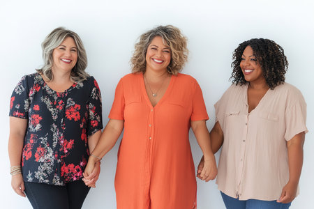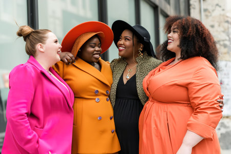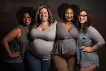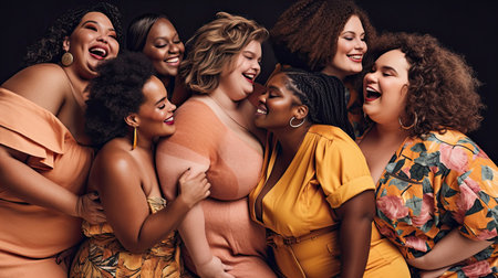 Diverse group of curvy, plus size, active, big, chubby woman standing next to each other. AI generative illustration, plus size beauty campaign