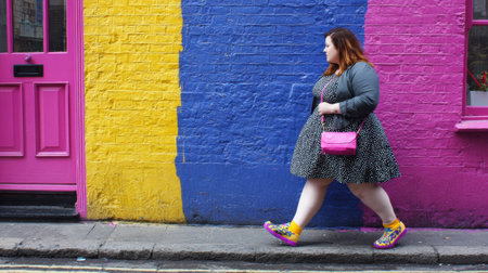 An overweight woman in her 40s walking confidently down the street, wearing stylish clothing and a smile, with city life in the background.