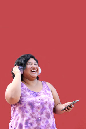 Young 20-year-old brunette and fat woman uses headphones connected to her cell phone to listen to music, playlists, podcasts, audiobooks