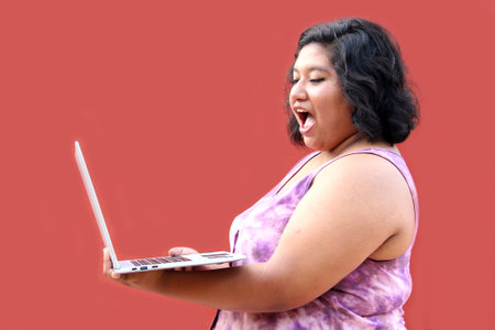 Young overweight 20 year old Latina brunette woman uses her laptop to do schoolwork, look for a job, shop in poverty