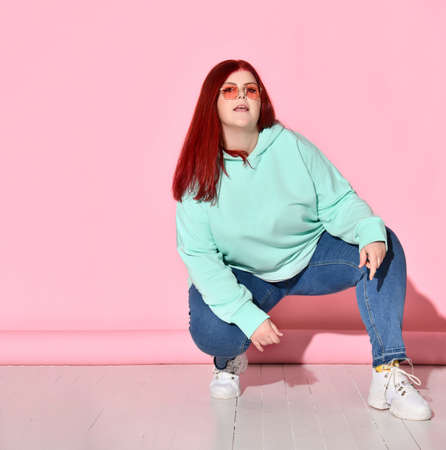 Confident chubby woman in jeans, bright sweater and stylish glasses poses squatting on floor. Stylish and trendy, curvy lady, motivation, diet, self-acceptance. Full length portrait isolated on pink