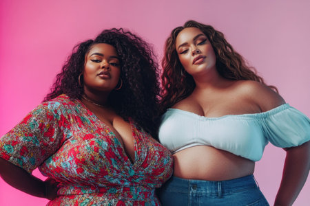 plus size women, confident poses, vibrant colors, pink background, diverse beauty, fashion, empowerment, body positivity, stylish outfits, representation, self love, modern aesthetics, friendship, ca