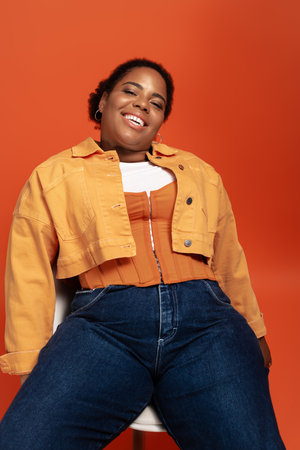 Overweight african american woman in orange sweater on orange background
