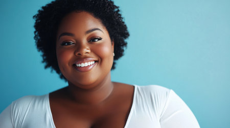 Smiling woman radiates confidence and joy, posing against a colorful backdrop, representing inclusivity and positive body image.
