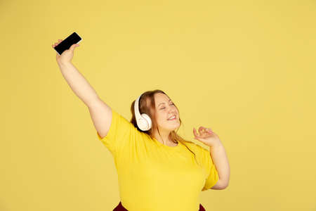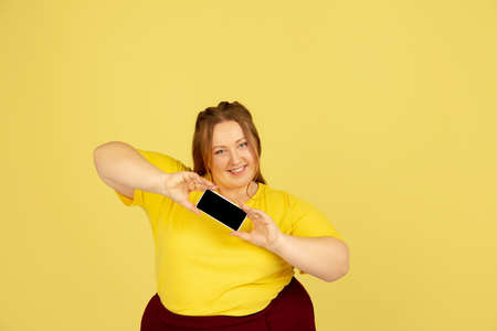 Shows phone screen. Beautiful plump caucasian plus size model isolated on yellow studio background. Concept of inclusion, human emotions, facial expression, sales, body positive. Copyspace for ad.