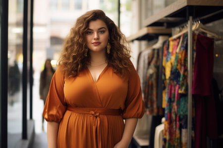 Portrait of an oversized brown-haired woman in an orange dress in the background of a clothing store.