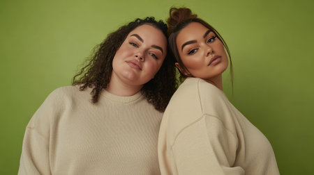 Two women standing close together, wearing beige sweaters, against a green background.