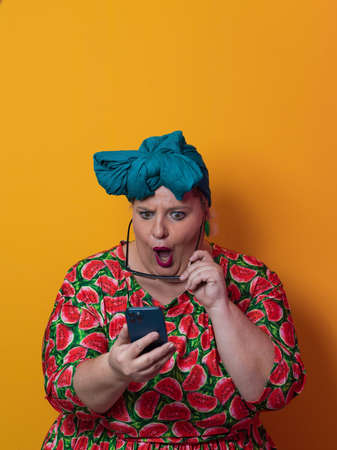Shows phone screen. Beautiful plump caucasian plus size model isolated on yellow studio background. Concept of inclusion, human emotions, facial expression, sales, body positive. Copyspace for ad.