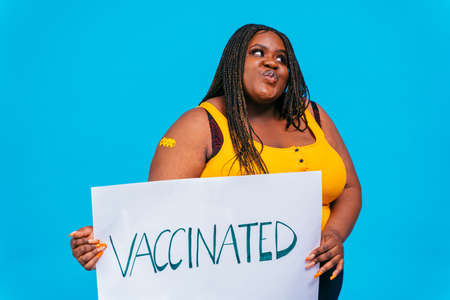 Kharkiv, Ukraine - November 06, 2020: Instagram app. Social network. Mobile application. Public account. Smiling plus size woman holding paper note with symbol icon isolated blue.