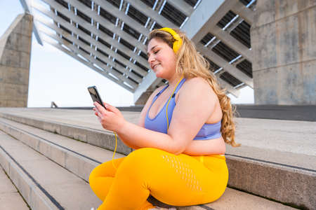 Young 20-year-old brunette and fat woman uses headphones connected to her cell phone to listen to music, playlists, podcasts, audiobooks