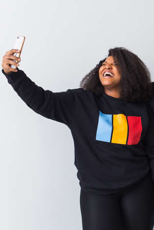Surprised emotional happy darkskinned curly woman in pink sunglasses and purple hoodie blows kiss and takes selfie outside : Generative AI