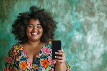 Smiling woman radiates confidence and joy, posing against a colorful backdrop, representing inclusivity and positive body image.