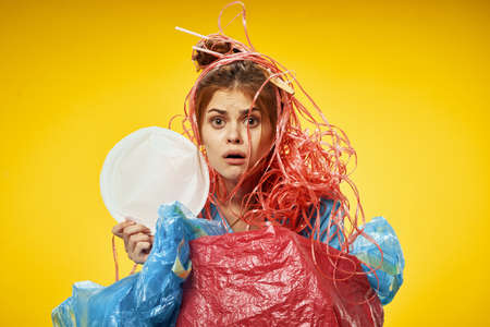 Portrait of girl with waste, plastic bags, polyethylene, trash, garbage on head. Young woman is choking, bounded with signal tape, holding sign stop. Earth is suffering from environmental pollution.