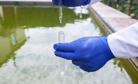 water sample. Bacterial control of pool water. Checking the amount of algae, harmful substances and chemicals. Laboratory study of water from artificial reservoirs. Taking liquid into a test tube